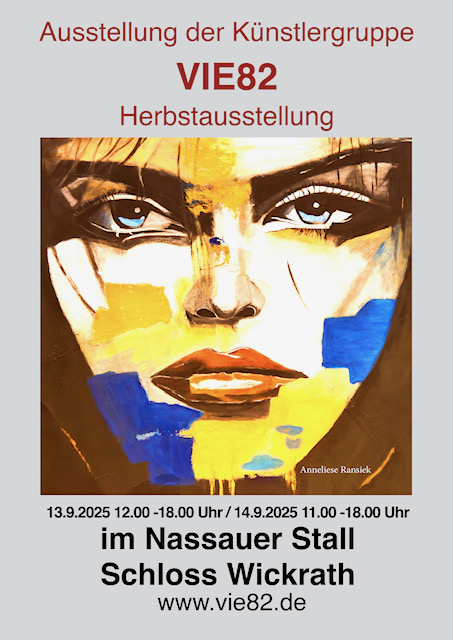 Gerne laden wir, die Mitglieder der Künstlergruppe VIE82, zu unserer Herbstausstellung 2025 in den Nassauer Stall im Schloss Wickrath ein.
